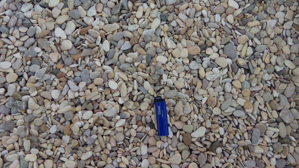 - Цвет, фактура: гладкие, плоские камешки, преобладает серый, светло-серый цвет.